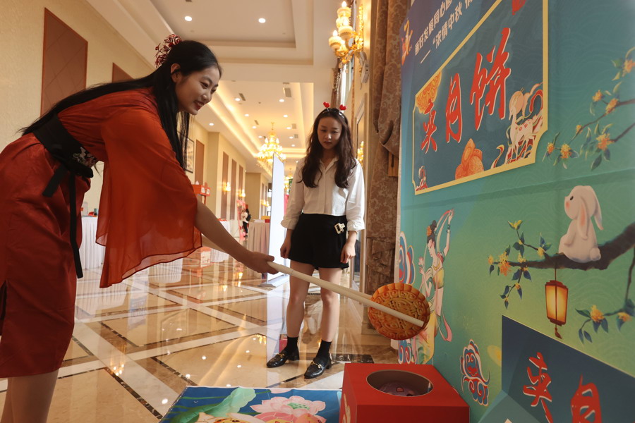 白領(lǐng)們參與趣味投壺、猜燈謎、夾月餅等中秋游園活動(dòng)。