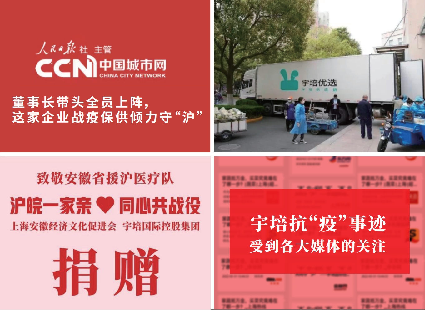 向新滬商聯(lián)合會、上海安徽經(jīng)濟文化促進會、上海新虹社區(qū)發(fā)展基金會捐款50多萬,向上海100多個社區(qū)捐贈“宇培吉品”預制菜、蔬菜包價值120萬元。向上海市關心下一代工作委員會辦公室捐贈40萬元,資助開展“百年百影進百校、百老百講育新人”紅色觀影活動。